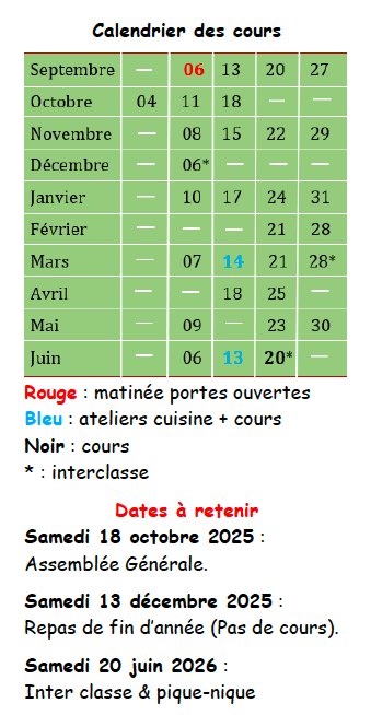 - Tous les samedis, de 10h30 à 12h00, selon le calendrier fourni lors de l’inscription.